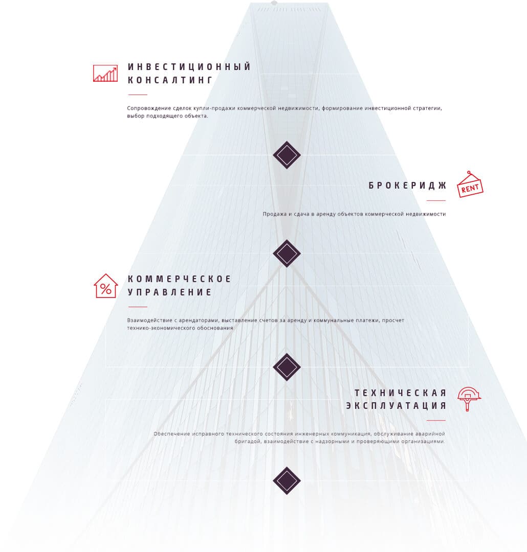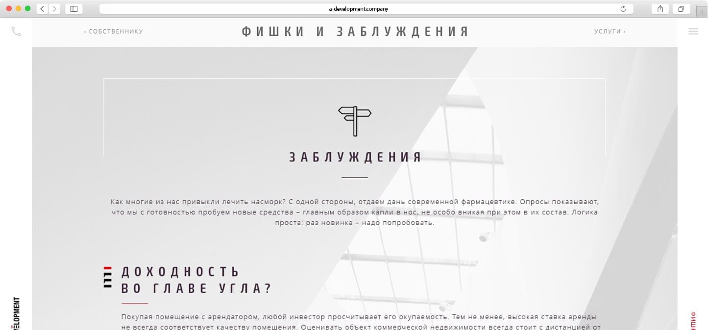 Большой перечень профессиональных услуг в области коммерческой недвижимости, сопровождение на любом этапе работы, которые позволят клиенту забатывать деньги, используя знания и умения A-DEVELOPMENT.