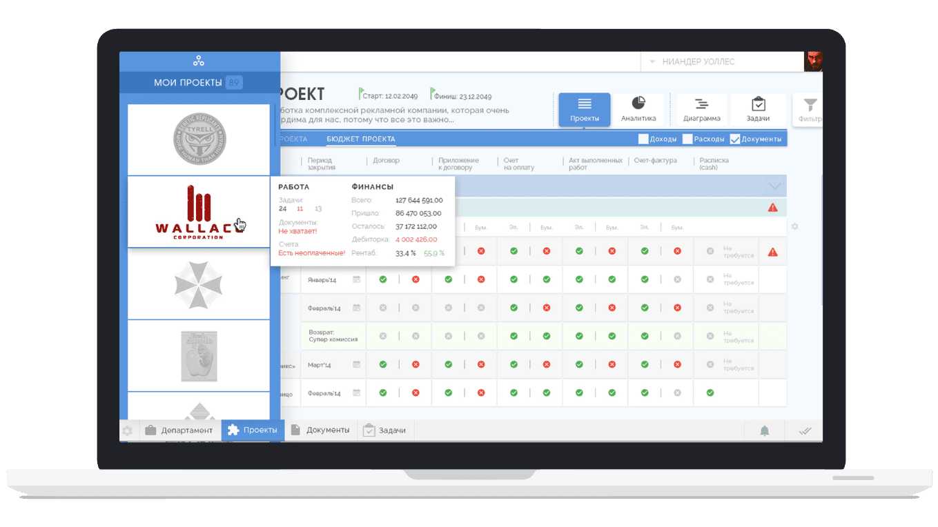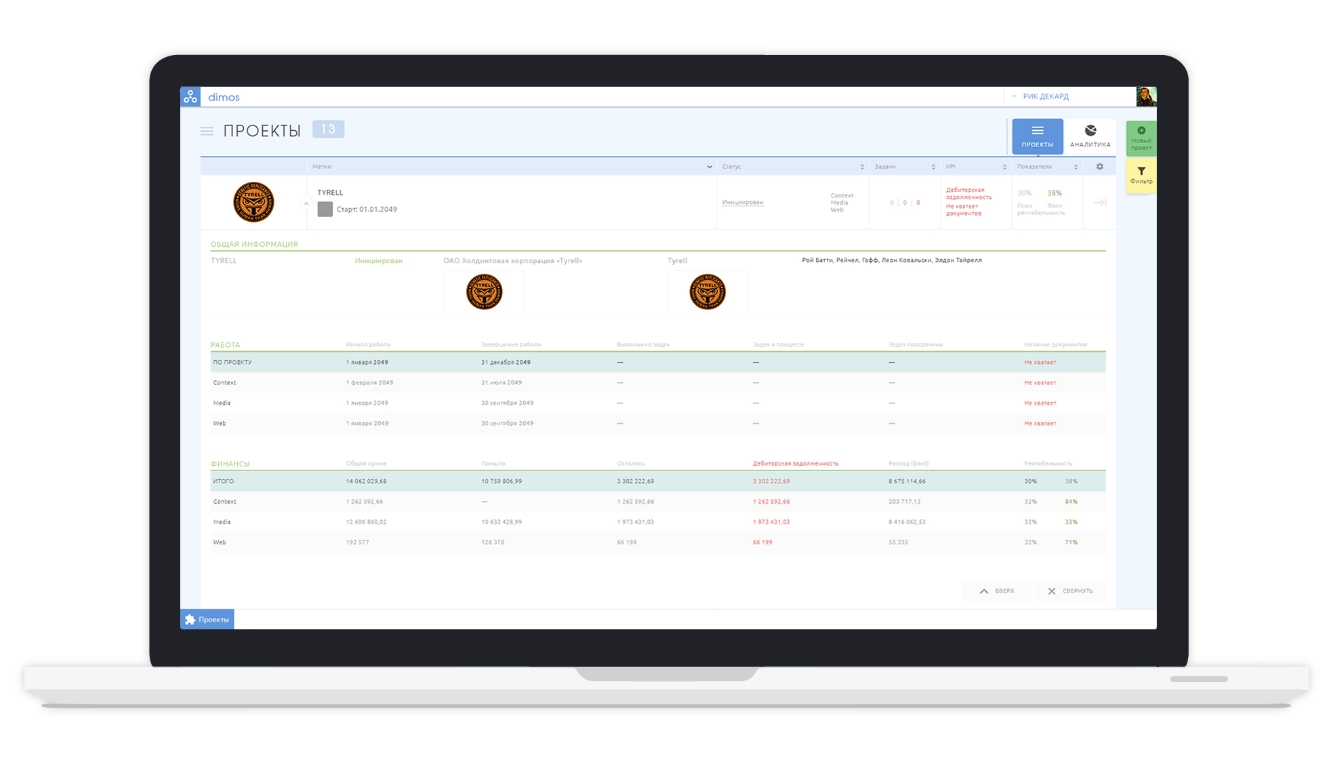 Вся информация по каждому проекту в одном месте. Всё под рукой — поставленные, выполненные и просроченные исполнителями задачи, переписка по проекту, по задачам, плановые и фактические финансовые показатели, все документы.