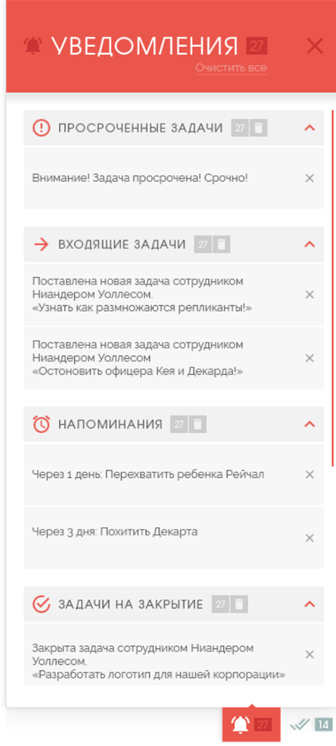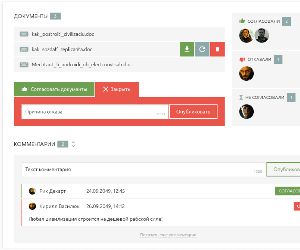 Один из самых важных модулей в системе — постановка и контроль исполнения задач. Множество ролей в задачах, дробление задач на микро-задачи, постановка задач группе, обсуждения и дискуссии, хранение рабочих файлов, уведомления и напоминания на почту — всё это неполный перечень возможностей модуля.
