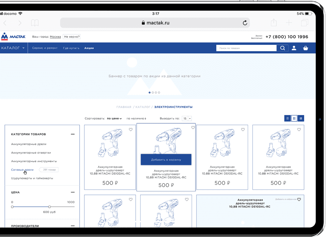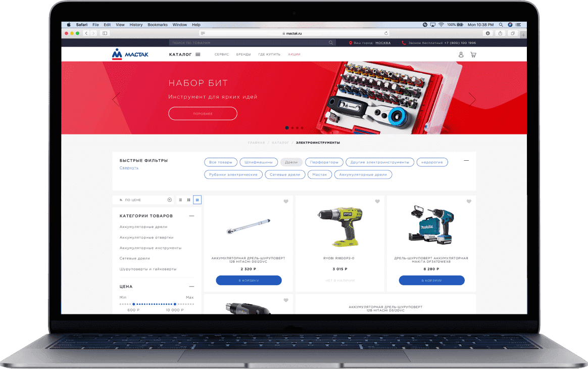 Начнём с конца. Это то, что получилось в результате — интернет-магазин «Мастак», предлагающий огромный выбор профессионального инструмента и оборудования.